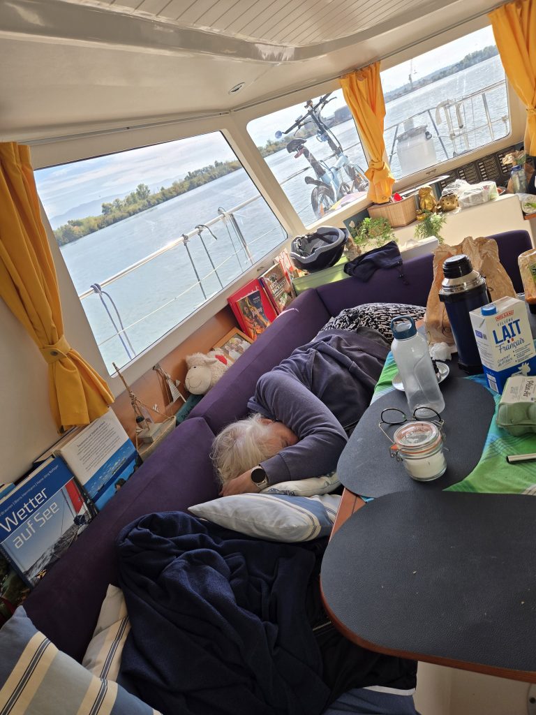 Abfahrt von Valence…nach dem Kaffee hat Doro Freiwache. Sie ist gerade angekommen nachdem sie die ganze Nacht unterwegs war bzw. die Nacht am Flughafen verbracht hatte. Frühstück gibt es später bei der Fahrt.