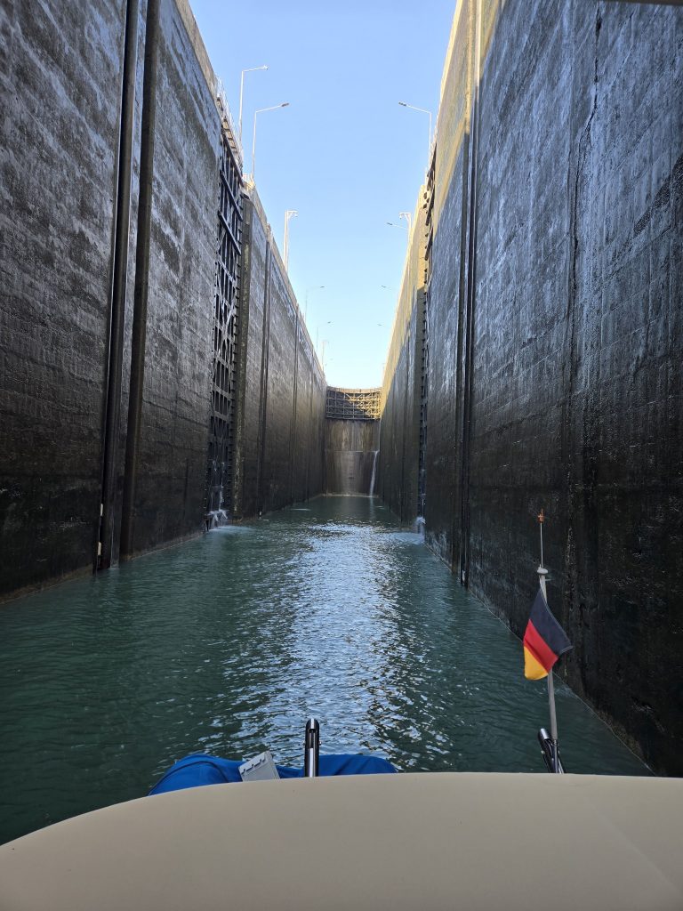Die großen Schiffe passen saugend in die Schleuse. Wir haben etwas mehr Platz.