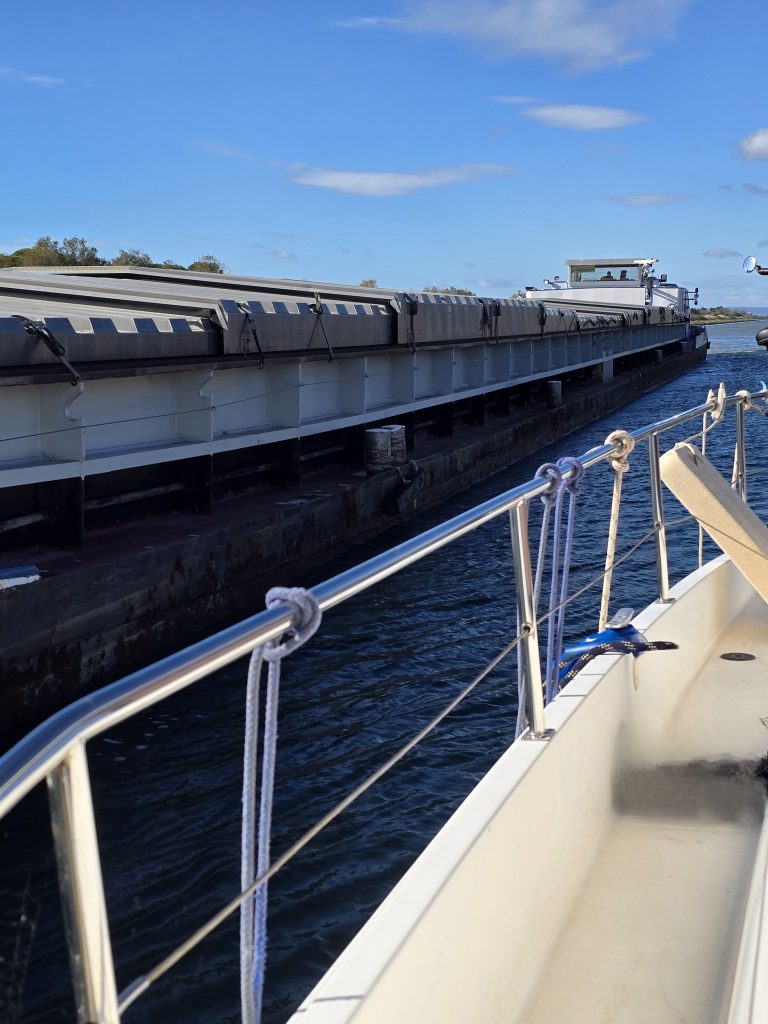 Brücke ist geöffnet. 4 Boote fahren durch. Wir und ein französischer Segler biegen Richtung Meer ab. Da ist die Ausfahrt. Anzeigen sind von km/h auf Seemeilen umgestellt.